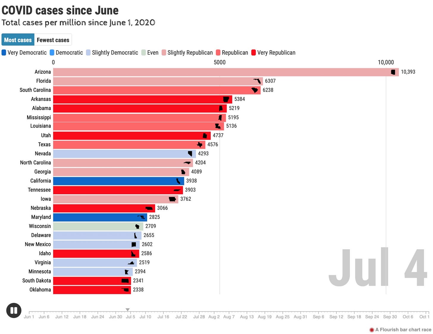 3). Dan Goodspeed. Without doubt, the most mind-blowing data visualization I can recall came during Covid. A dynamic chart (think train station split-flap displays that shuffle and update) follows Covid outbreaks by state. As cases grow, an indisputable trend surfaces right before your eyes: states that vote primarily Republican are infected far more than those who vote blue. Disinformation kills.