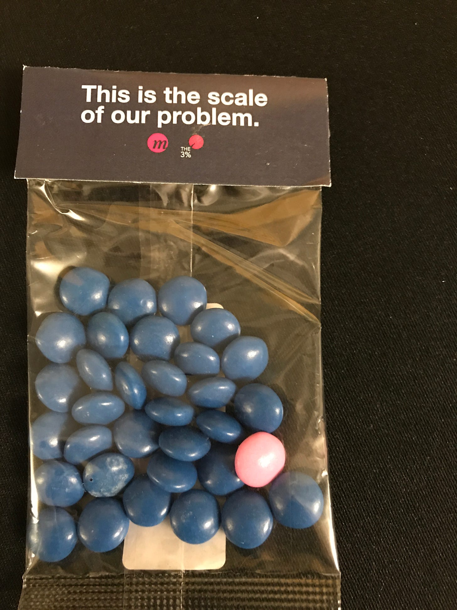 The following year we put dot stickers randomly on 3% of our conference’s printed programs. Then asked people who had a dot to stand up during opening remarks. It personalized a stat in a way that was hard to forget… and embarrassing to behold.