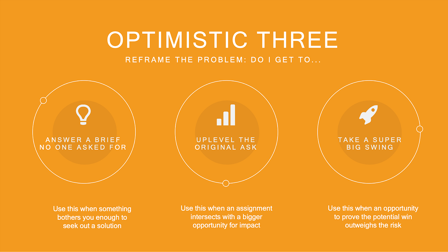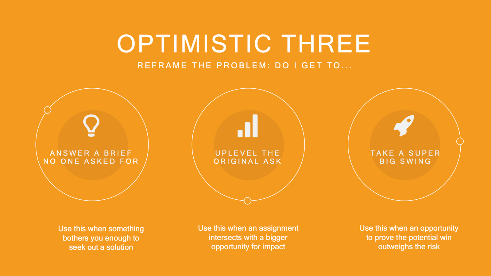 LS: This is a tool I use to get into the optimistic mindset. By reframing the challenge as an opportunity, and “organizing” the opportunity into the right category, you can right size the ask and organize your approach to it.
