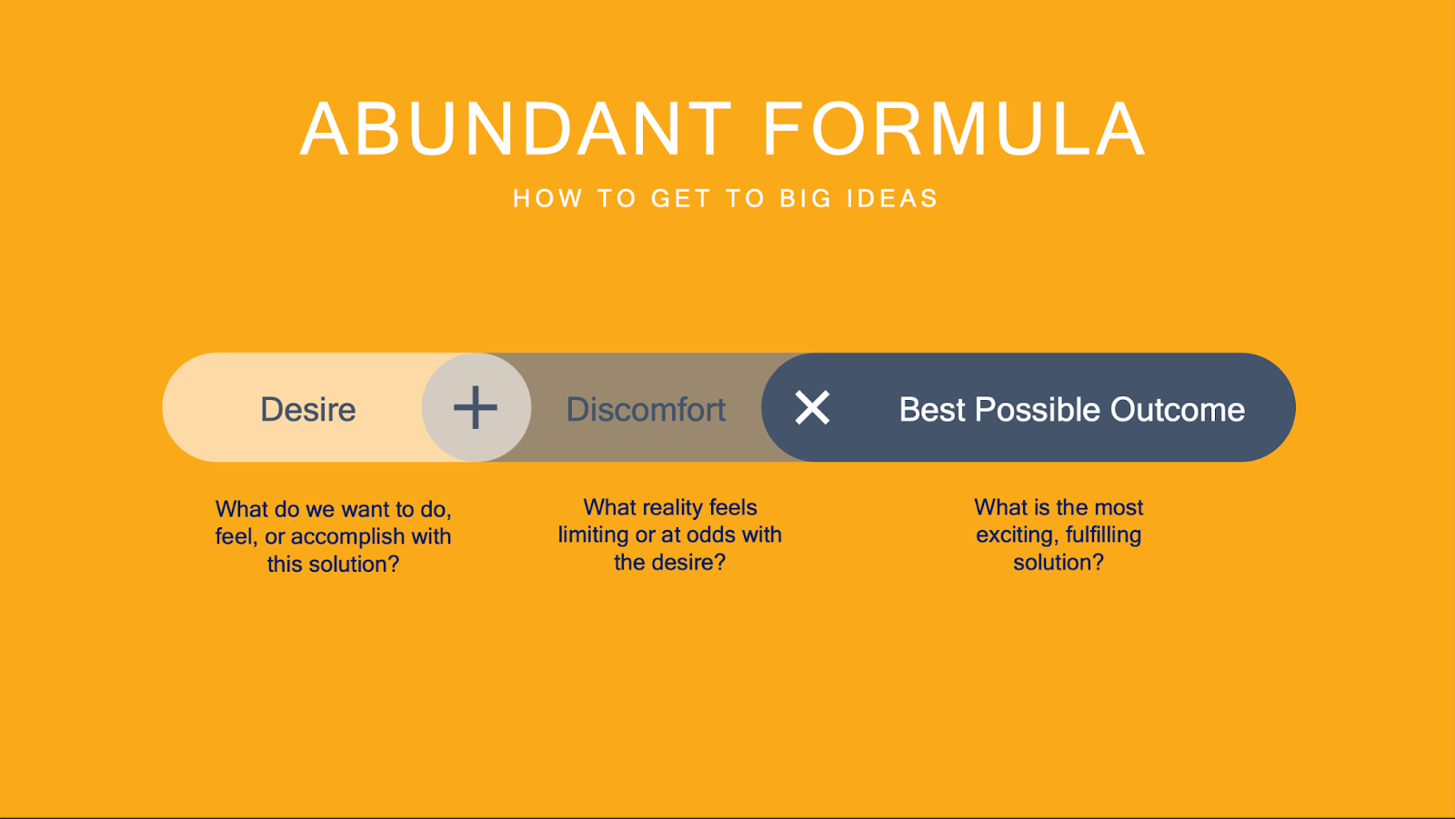 The desire should always be simple and singular. The discomfort should always be brutally honest—what are you really up against? And the best possible outcome is to get you thinking beyond what would be “good enough.” This is where you really let optimism lead.